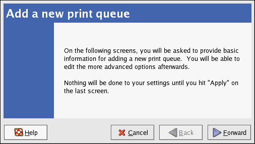 To add a local printer, such as one attached through a parallel port or USB port on your computer, click the New button in the main Printer Configuration Tool window to display the window in Figure 36-2. Click Forward to proceed.