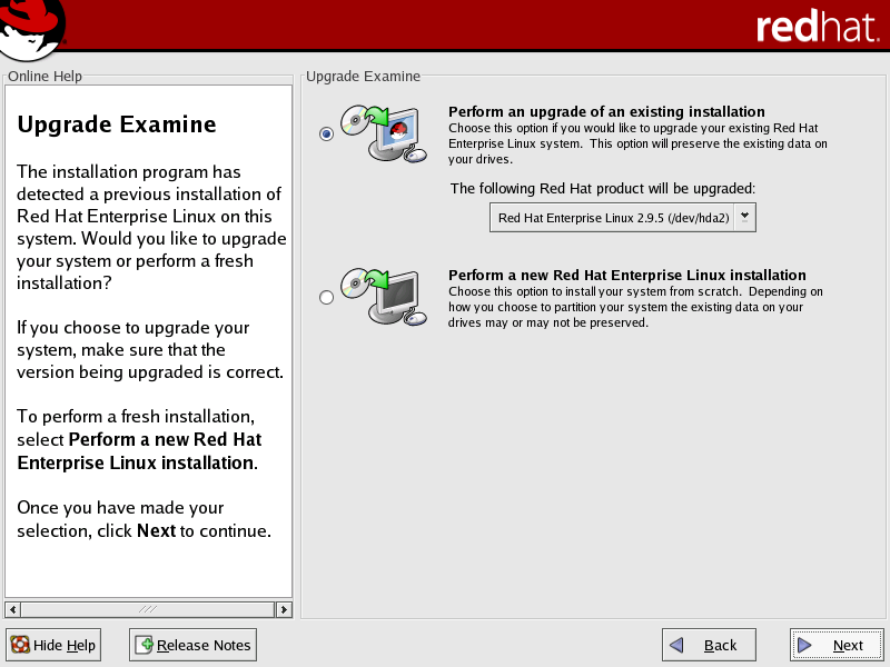 Use the linux upgradeany command if your Red Hat Enterprise Linux installation was not given as an option to upgrade. |