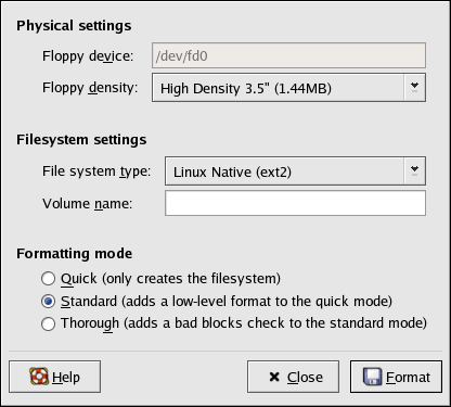 To start gfloppy, choose Main Menu => System Tools => Floppy Formatter. From a shell prompt, type /usr/bin/gfloppy. As shown in Figure 11-2, the gfloppy interface is small and has few options. The default settings are sufficient for most users and needs; however, you can format your diskette with an MS-DOS file system type if necessary. You can also choose the density of your diskette (if you are not using the usual high density 3.5" 1.44MB diskette). You can also elect to quick format the diskette if it was previously formatted as ext2.
