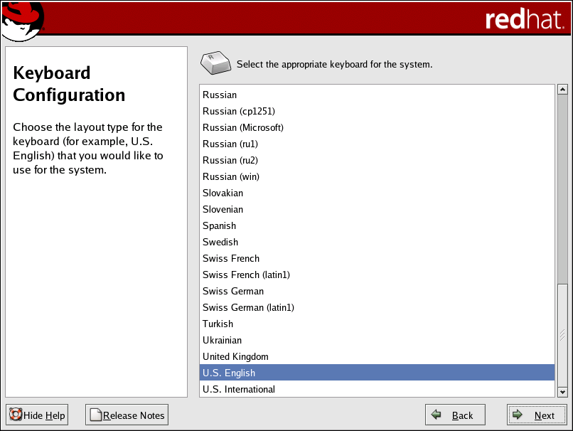 Using your mouse, select the correct layout type (for example, U.S. English) for the keyboard you would prefer to use for the installation and as the system default (refer to Figure 4-8).