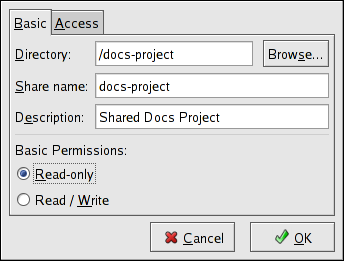 • Basic Permissions — Whether users should only be able to read the files in the shared directory or whether they should be able to read and write to the shared directory.